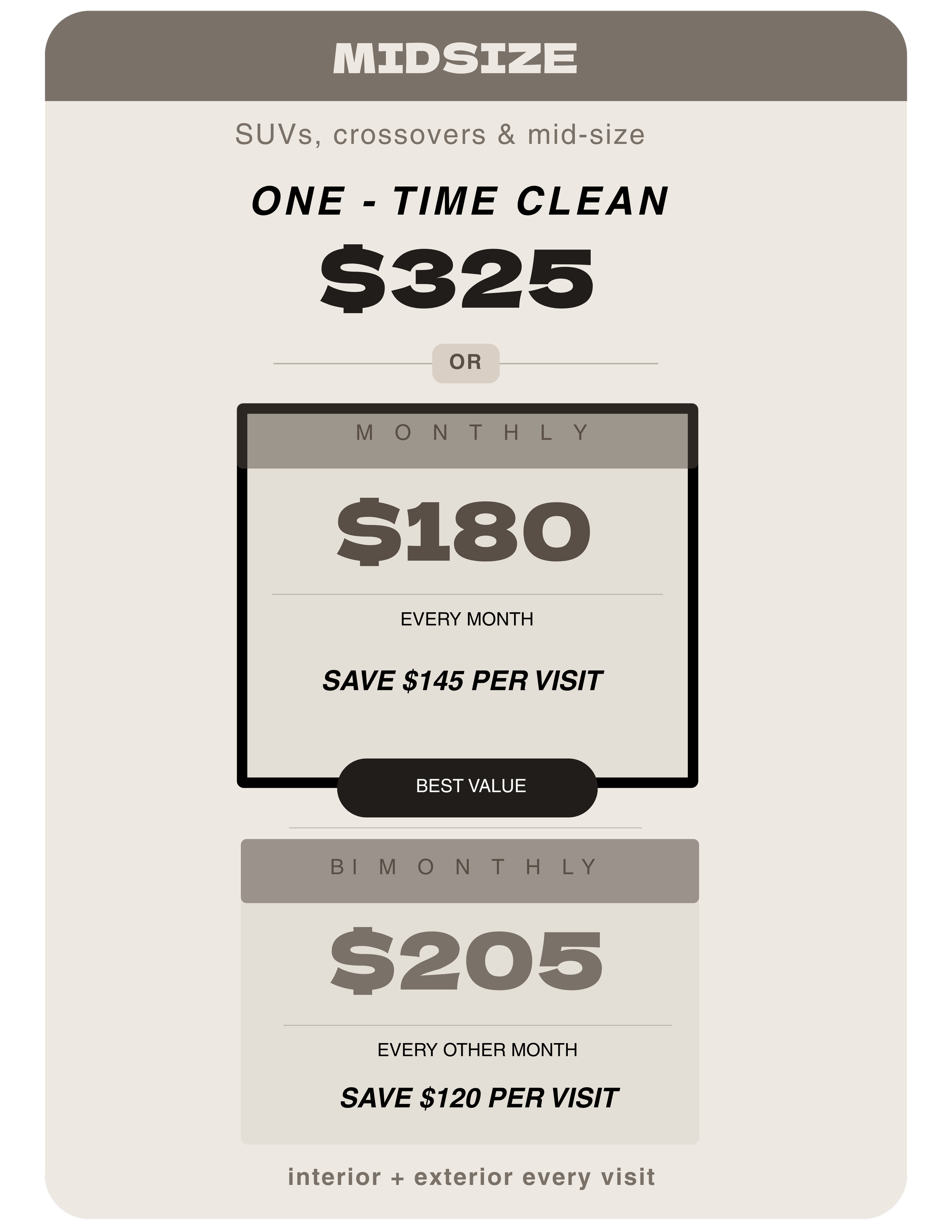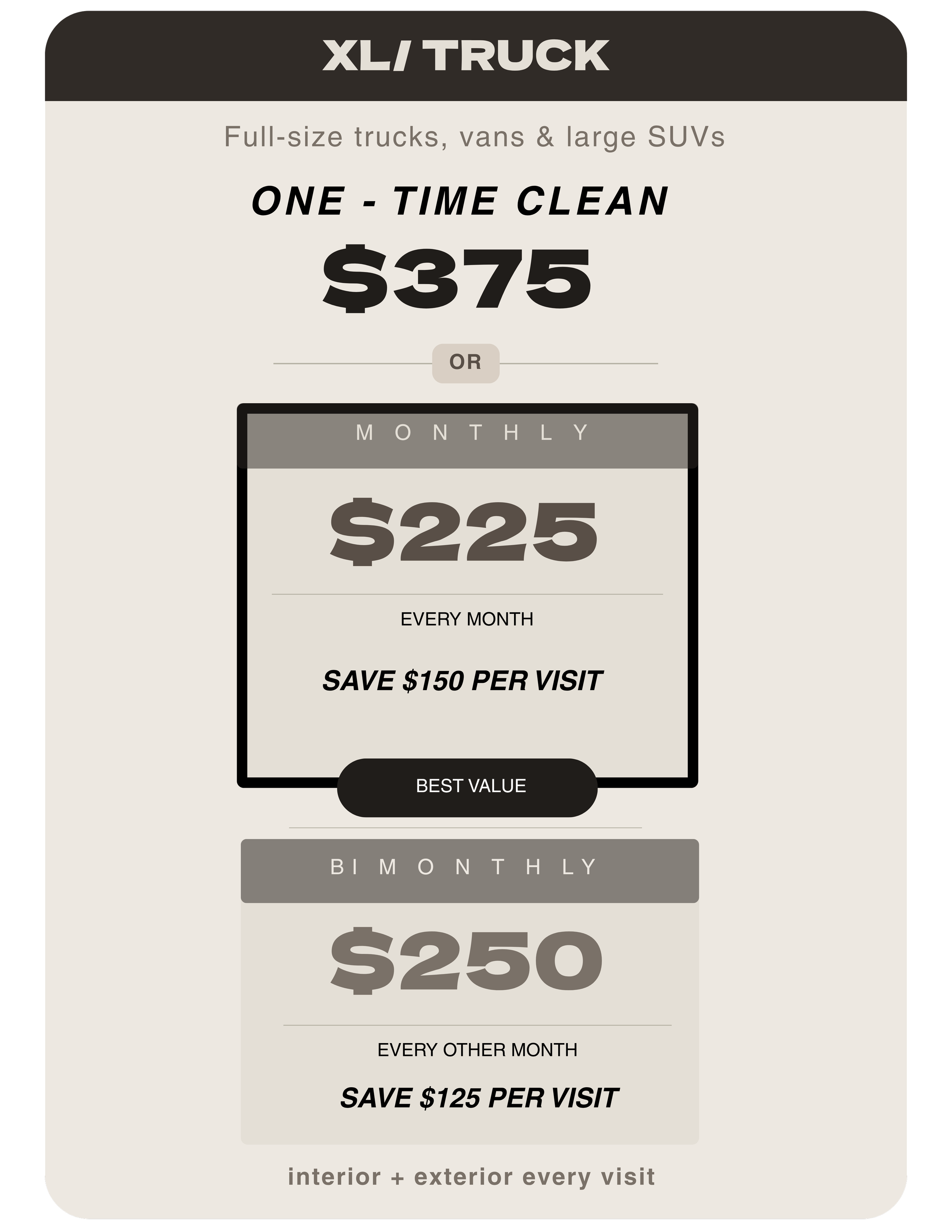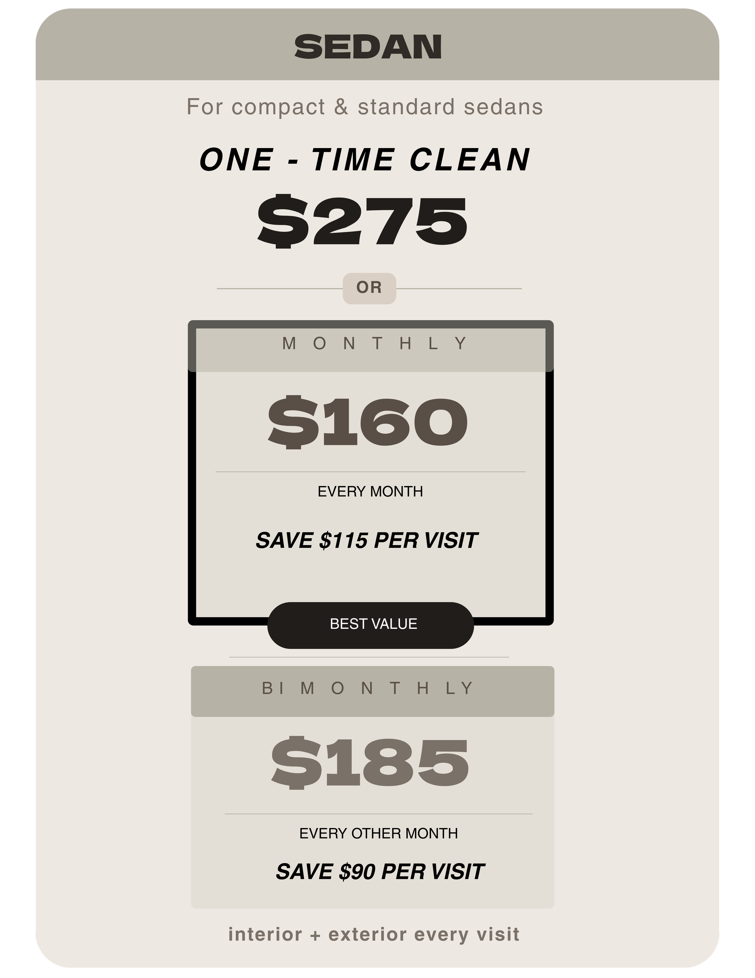 An effortless way to keep your car consistently clean and protected. Choose a plan that fits your lifestyle—bi-weekly, monthly, or bi-monthly—and enjoy exclusive discounted rates on every visit. Once you’re signed up, we handle the rest: your appointments stay on schedule, your card is charged automatically, and your vehicle always looks freshly detailed. No booking, no reminders—just a seamless, luxury-level clean that keeps your car turning heads year-round.
